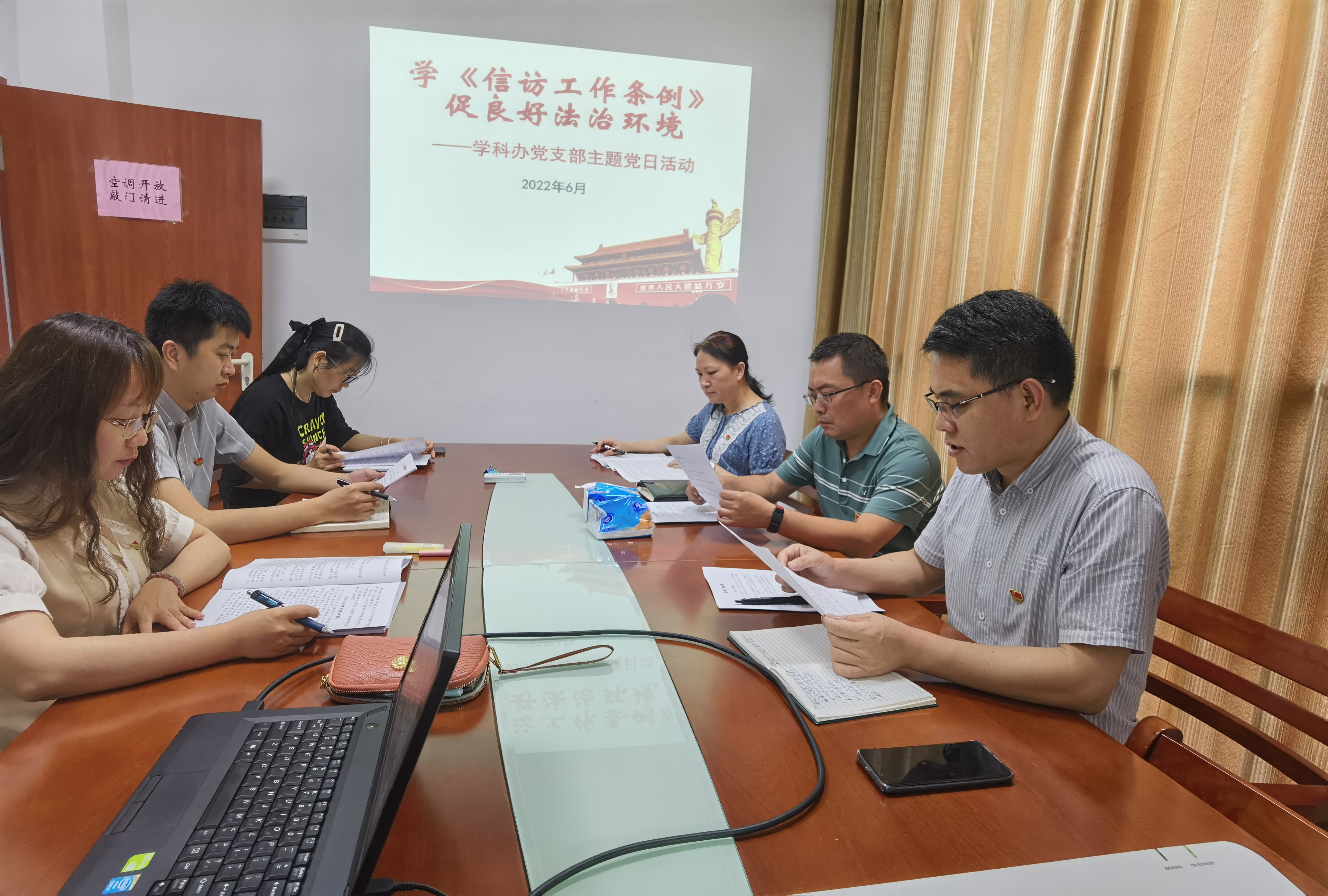 中共中央、国务院印发的《信访工作条例》(以下简称《条例》)自2022年5月1日起施行。为深入学习贯彻习近平总书记关于加强和改进人民信访工作的重要思想,6月9日上午,学科办党支部开展了“学《信访工作条例》促良好法治环境”主题党日活动,活动由支部书记郑景辉主持。