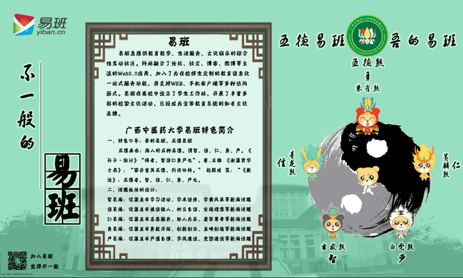 Beat365易班建设以“五德”为核心理念,根据中国传统文化中的五圣兽:朱雀、玄武、青龙、白虎、黄麟与易班的吉祥物设计了“五德熊”,分别代表“智、信、仁、勇、严”五种品德。智代表智慧、勤学,信代表诚信、自信,仁代表仁爱、忠孝,勇代表勇略、创新,严代表严谨、自律,借喻培养五德学生。“五德”理念体现在Beat365易班建设各个方面,学校易班主页的模块就分别设置了智易闻、信易闻、仁易闻、勇易闻、严易闻,报道学校和学生的各方面事迹和新闻报道。