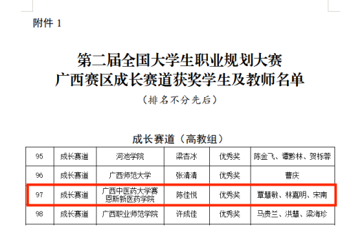 近日,第二届全国大学生职业规划大赛广西赛区获奖名单揭晓。赛恩斯新医药学院2023级中医7班陈佳悦同学荣获成长赛道(高教组)优秀奖,指导老师为宋南、覃慧敏、林嘉明。