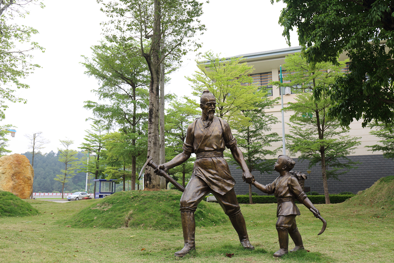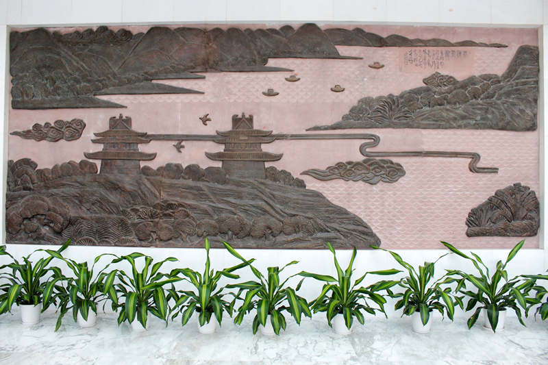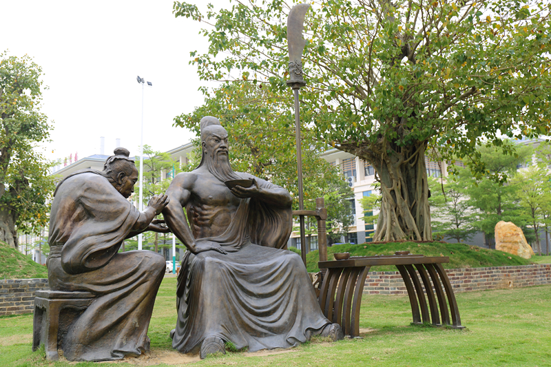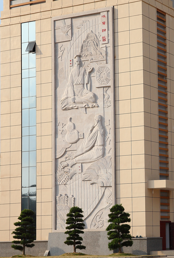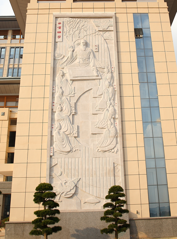 图书馆正门两侧的墙上有岐黄论医、杏坛讲学大型石刻浮雕,浮雕高16.8米,宽5.5米,由花岗岩雕刻而成。