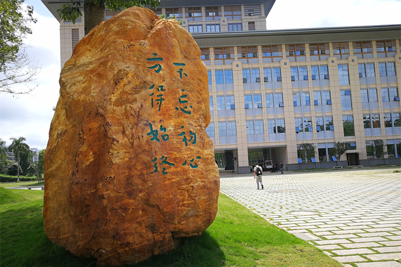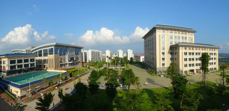 二楼大堂的地面上铺设有太极阴阳鱼图案,墙上是一幅由晨钟暮鼓楼校门及邕江组成的壁画,联曰:“月明风清更有半江渔火引目去,日曦气紫且迎一天云霞扑面来”。道出了位于邕江之畔的仙葫校区,依山傍水,环境优雅,在这里源远流长的华夏文化与博大精深的中医文化融为一体,很好地体现出学校的办学理念和校园文化特色,正是潜心学习和兴办大学的绝佳场所。