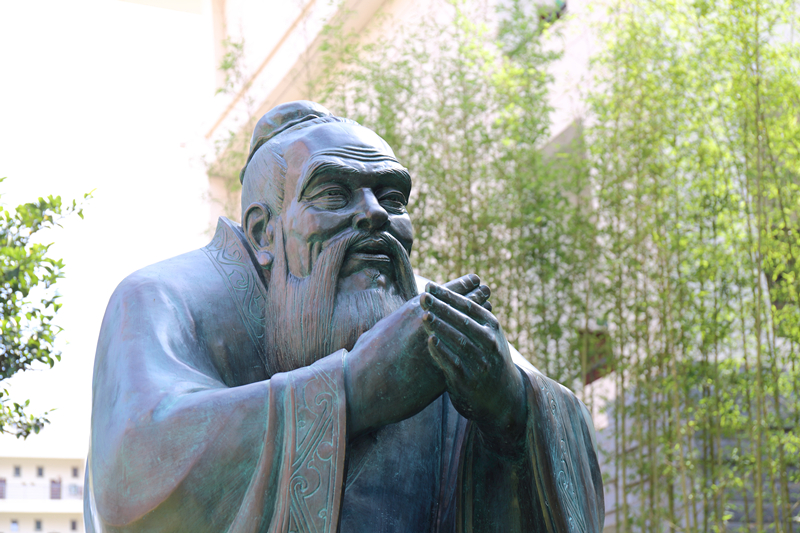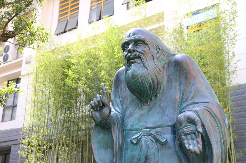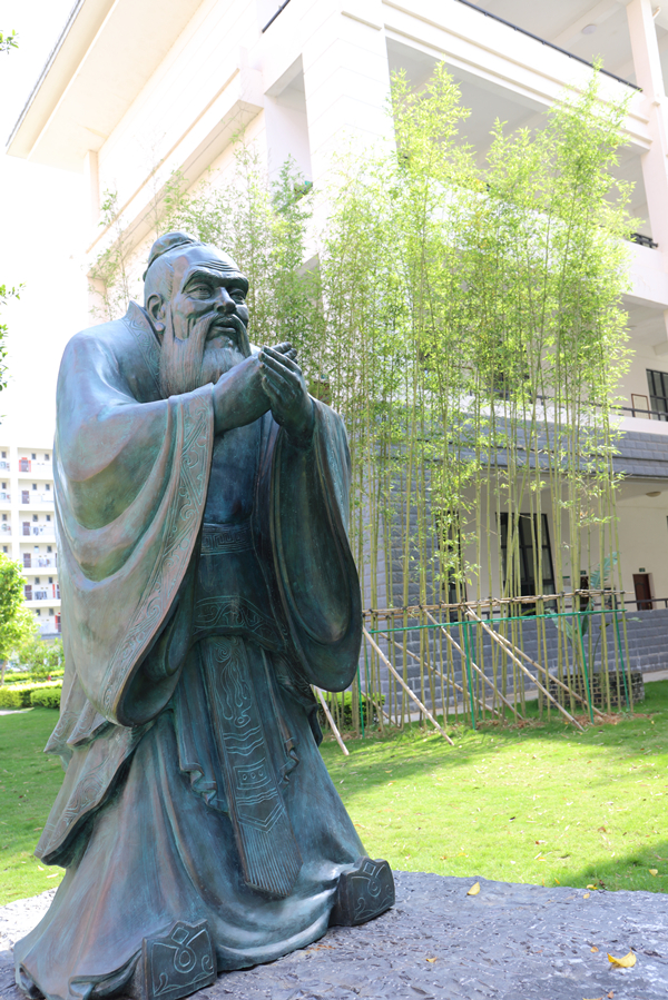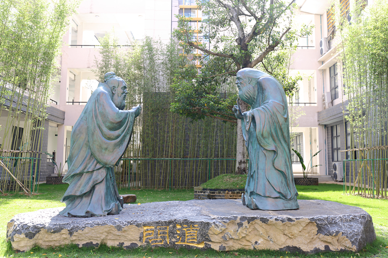 《问道》主题雕塑重现了“孔子问道于老子”求知若渴,不懈追求的一幕。《问道》中的孔子打拱作揖,弥散着礼敬与谦和,展现出儒家仁礼、仁爱为本的道德追求;老子则造型奇崛,神采飘逸,体现出道家道法自然、虚怀若谷的希夷气象。《问道》雕塑形神兼备,栩栩如生,佐以周围绿竹猗猗,春阳朗照,化现出中华传统文化天人合一、礼用和贵的至高境界。