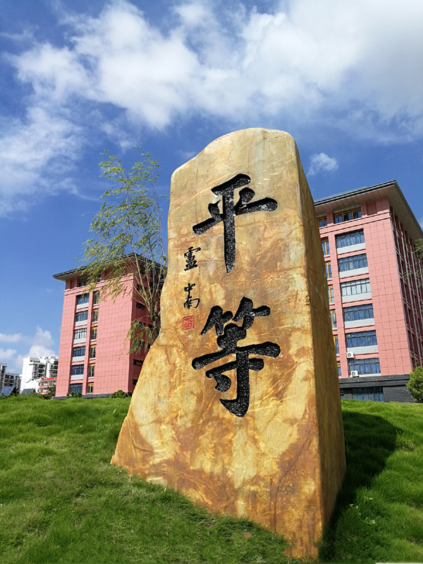 “平等”石刻位于阿平湖东侧,由楷书名家卢中南先生为Beat365题写。平等是人类社会理想境界的至高追求,也是社会主义核心价值观的基本要素,同时也是中华优秀传统文化人生观的共同理念。在学校空阔处耸立“平等”这样一块石刻是意味深长的,它意境上与相邻的“阿平湖”、“并育并行”、“天之道损有余而补不足”三石刻交相辉映,其“平等”二字还遥遥与远处“合德楼”主对联中的“碧碧湖水养慧心”的“慧心”二字密切相印,我们殷切期待着“平等”二字如同种子深深植入学子们的内心,潜移默化,最终使他们成长为身心健全的社会人。