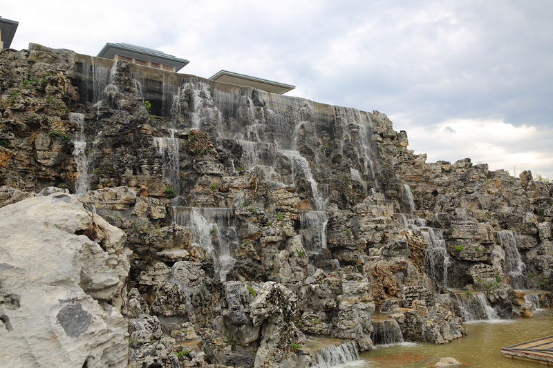 近日,瀑布成功试水,即将竣工验收。整个瀑布约20米的地势高差,宽幅30余米,在瀑布前方的水面上建有观景曲桥,可近距离欣赏瀑布“飞流直下”。
