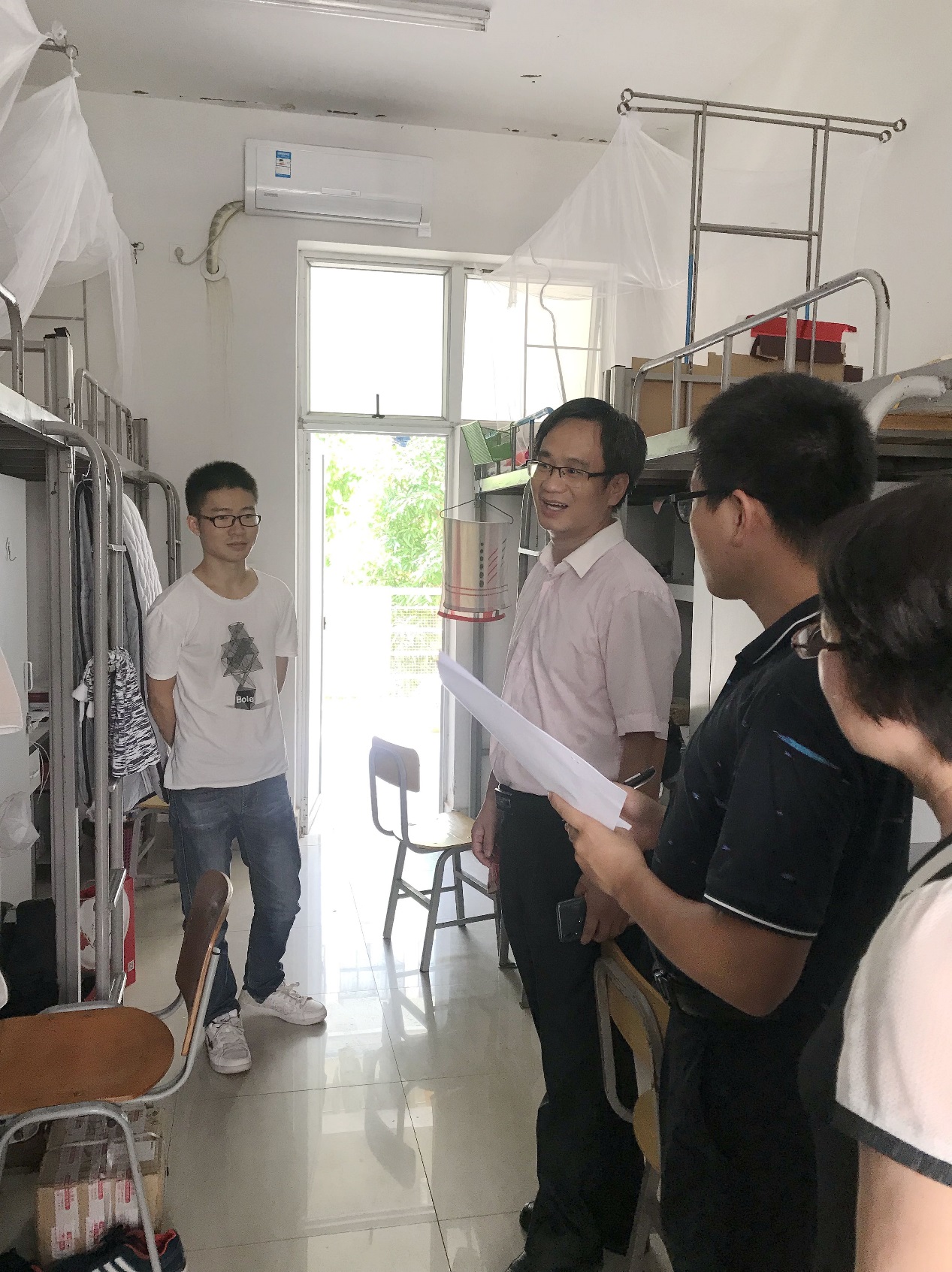 在检查过程中,研究生院党委副书记李朝晖及学生管理科老师慰问了解新生的住宿情况;要求研究生注意宿舍及实验室用水用电安全;节假日期间外出要注意交通安全、人身安全及财产安全;如有突发情况及时上报。