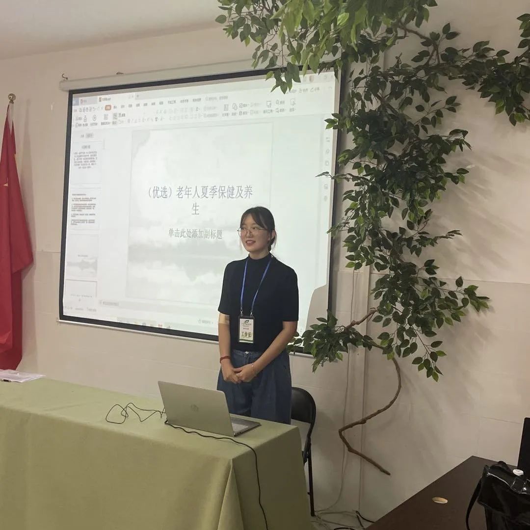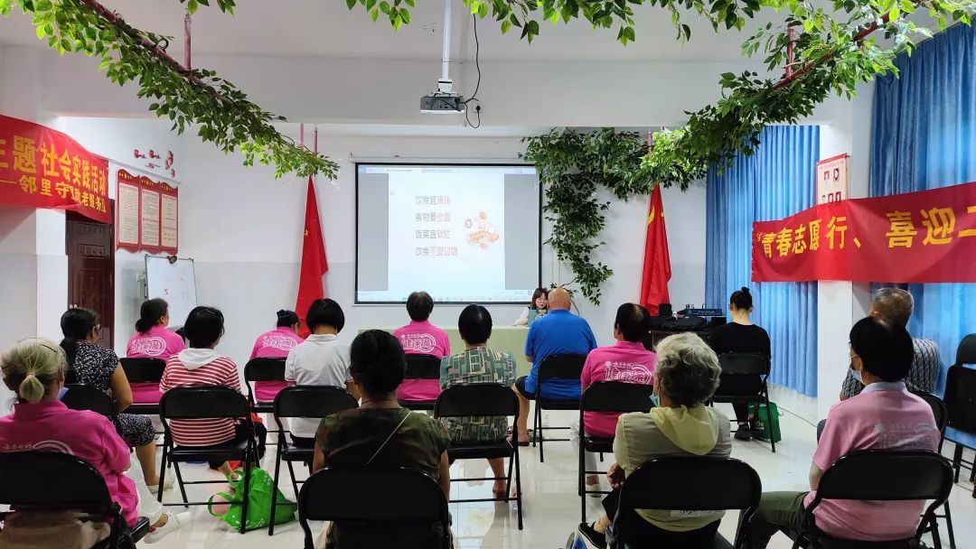 打完八段锦之后志愿者们对老年人进行养生知识的宣讲。首先是养生十六字方针:合理膳食、适量运动、戒烟限酒、心理平衡,再延伸到老年人夏季保健及养生的原则与方法。正所谓民以食为天,养生知识还是以“食”为主,宣讲内容贴近生活,老人们兴致也很高。