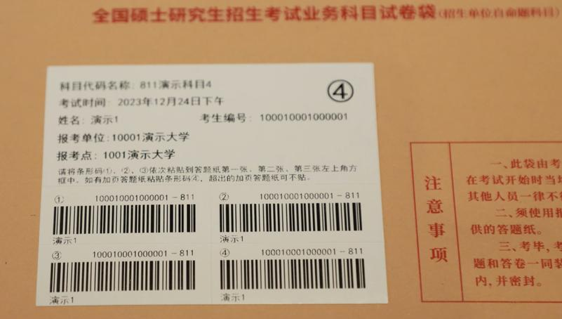 考生在参加自命题科目考试时,考点会给考生发放自命题试卷袋和自命题答题纸。考生拿到带有条形码自命题试卷袋后,请认真核对试卷袋标签上报考单位、考点、姓名、考生编号、考试科目等信息是否正确,袋上条形码是否完整(条形码见下图示例)。