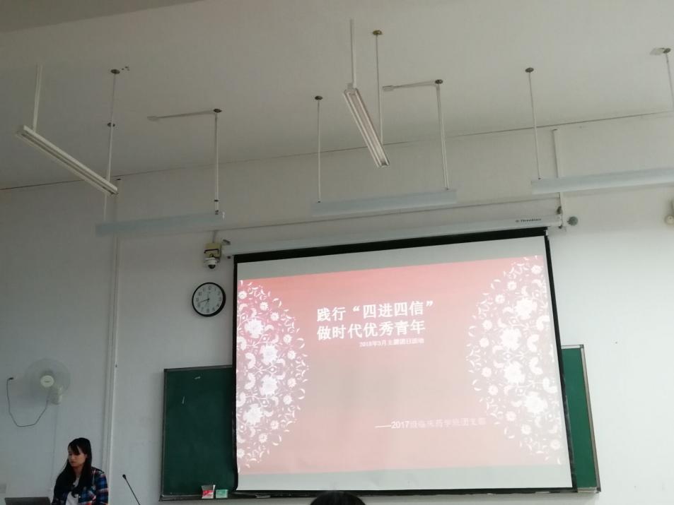 2018年3月25日,在仙葫校区教学楼3-205教室,2017级临床药学1班举行三月“四进四信”主题团日活动。