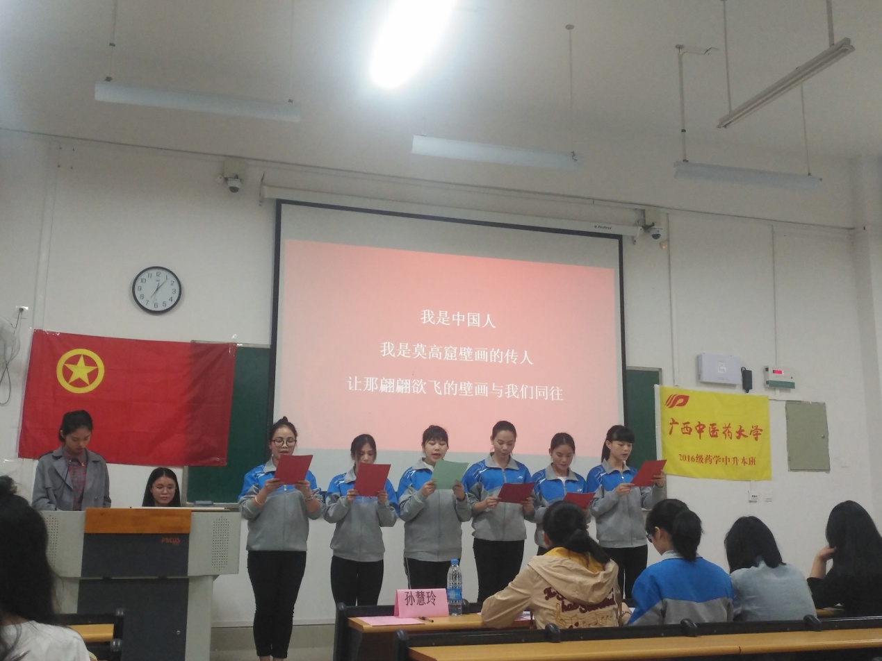 2016级药学中升本班于2018年3月28日19:00——20:30在教学楼1—104教室以朗诵比赛的形式开展了此次团日活动,本次活动有幸邀请到了年级辅导员—孙慧玲老师和其他班级代表出席,参赛作品主题围绕“爱国、爱党、中国梦”为内容,内容积极向上,具有时代气息。活动进行时,同学们用那饱满的热情歌颂着我们的祖国,还有抢答小游戏穿插整个活动,大家踊跃举手抢答,轻松活跃的氛围充斥着全场,通过游戏环节同学们学到了许多关于党关于祖国的知识,更受到十九大精神的感染。