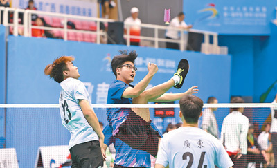 11月7日,第一届学青会大学男子组毽球三人赛,广西队以2∶0战胜广东队。图为双方队员在比赛中。 本报记者 陶相安摄