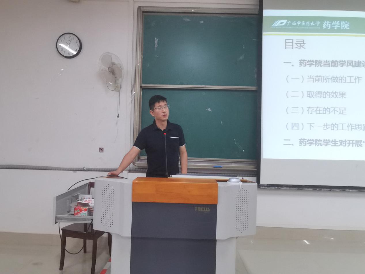 会上,吴玉峰从“四联系四服务”活动、“爱做笔记”活动、持续开展专业特色丰富第二课堂活动、寒暑期社会实践、学生综合素质培养工程、加强舆论引导和宣传力度等方面介绍了药学院学风建设工作相关活动开展情况,再从学生知识竞赛获奖、毕业生近四年研究生录取情况、英语四六级通过情况、选调生、西部计划志愿者、应征入伍、大创项目申报、体育文化节、易班建设等方面介绍药学院在学生工作方面取得的成效。