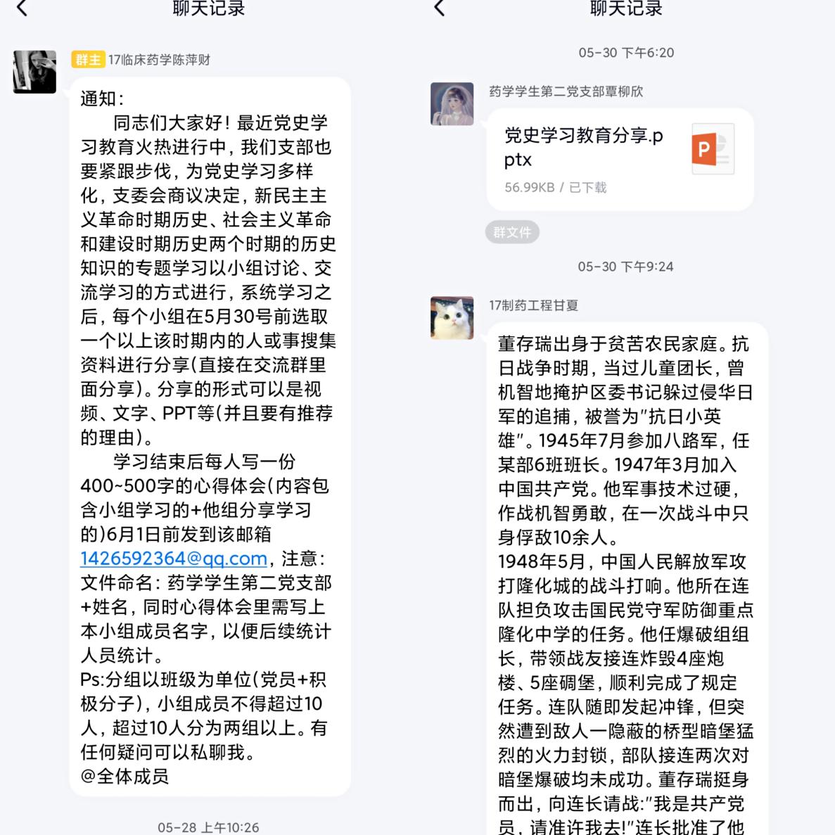 6月1日,支部通过小组讨论并分享的形式开展线上新民主主义革命时期历史、社会主义革命和建设时期历史两个时期的历史知识的专题学习。