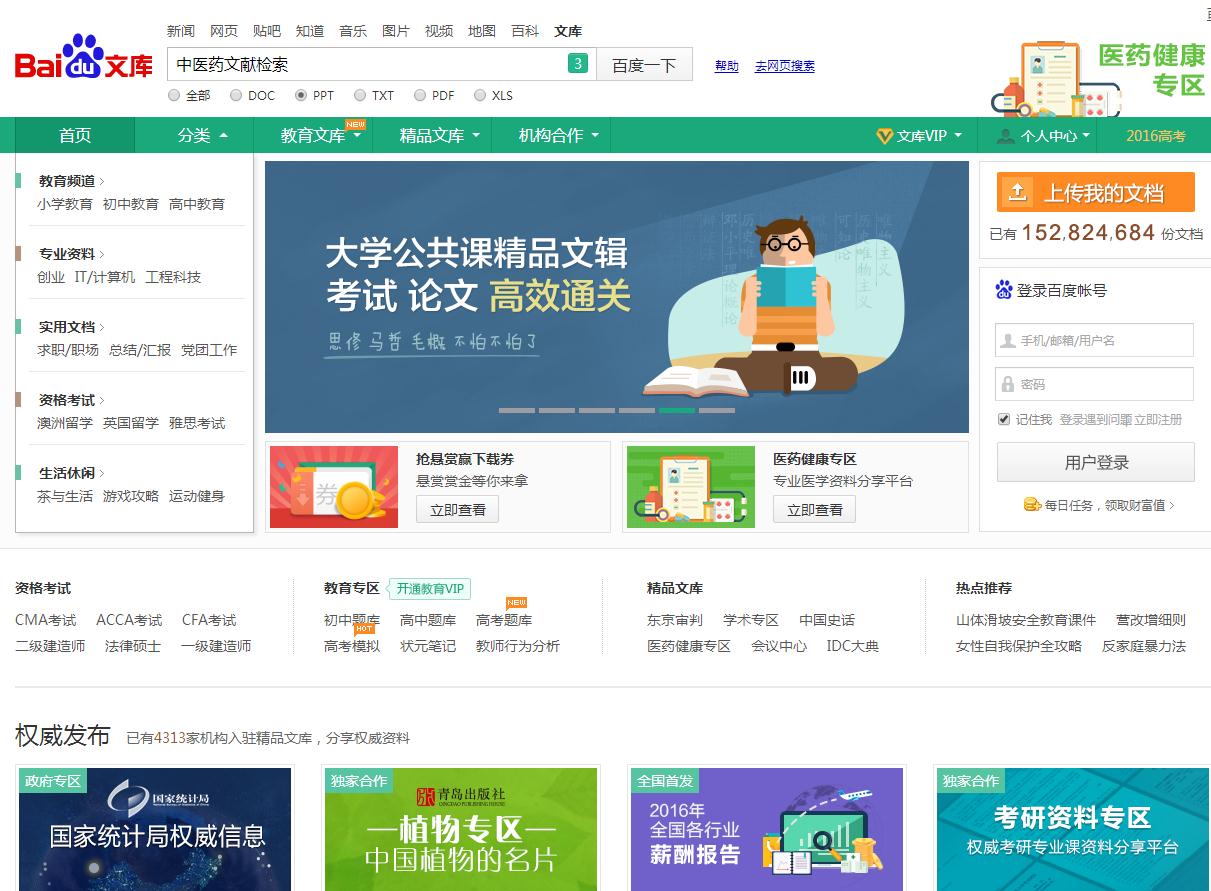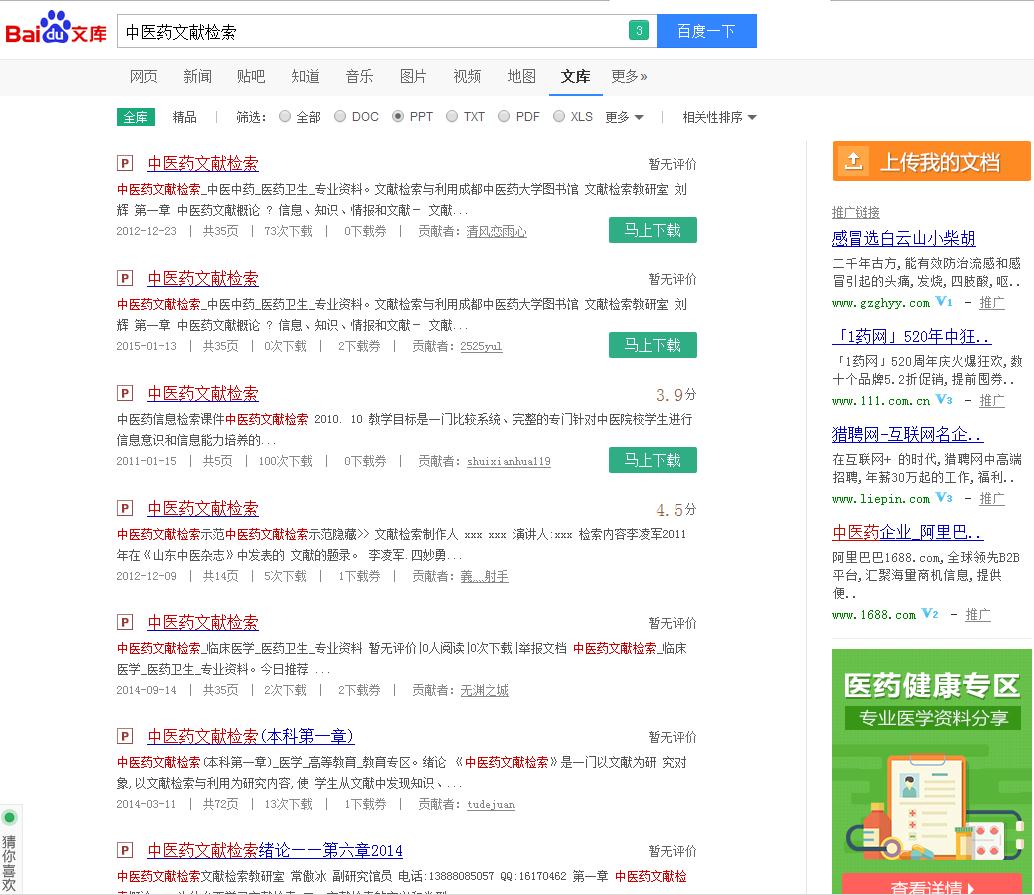 在百度文库检索界面中,检索途径选择PPT,检索框输入检索词中医药文献检索,点击百度一下进行检索