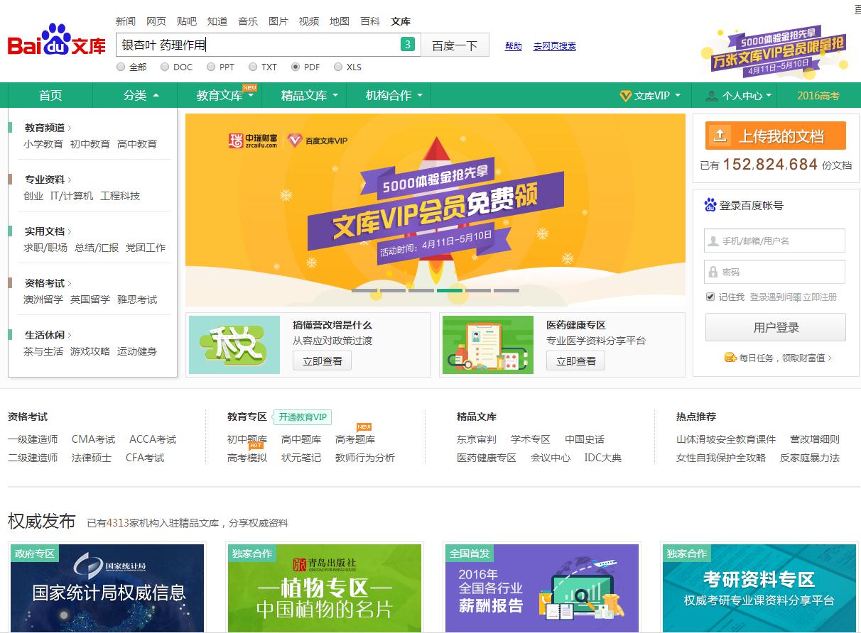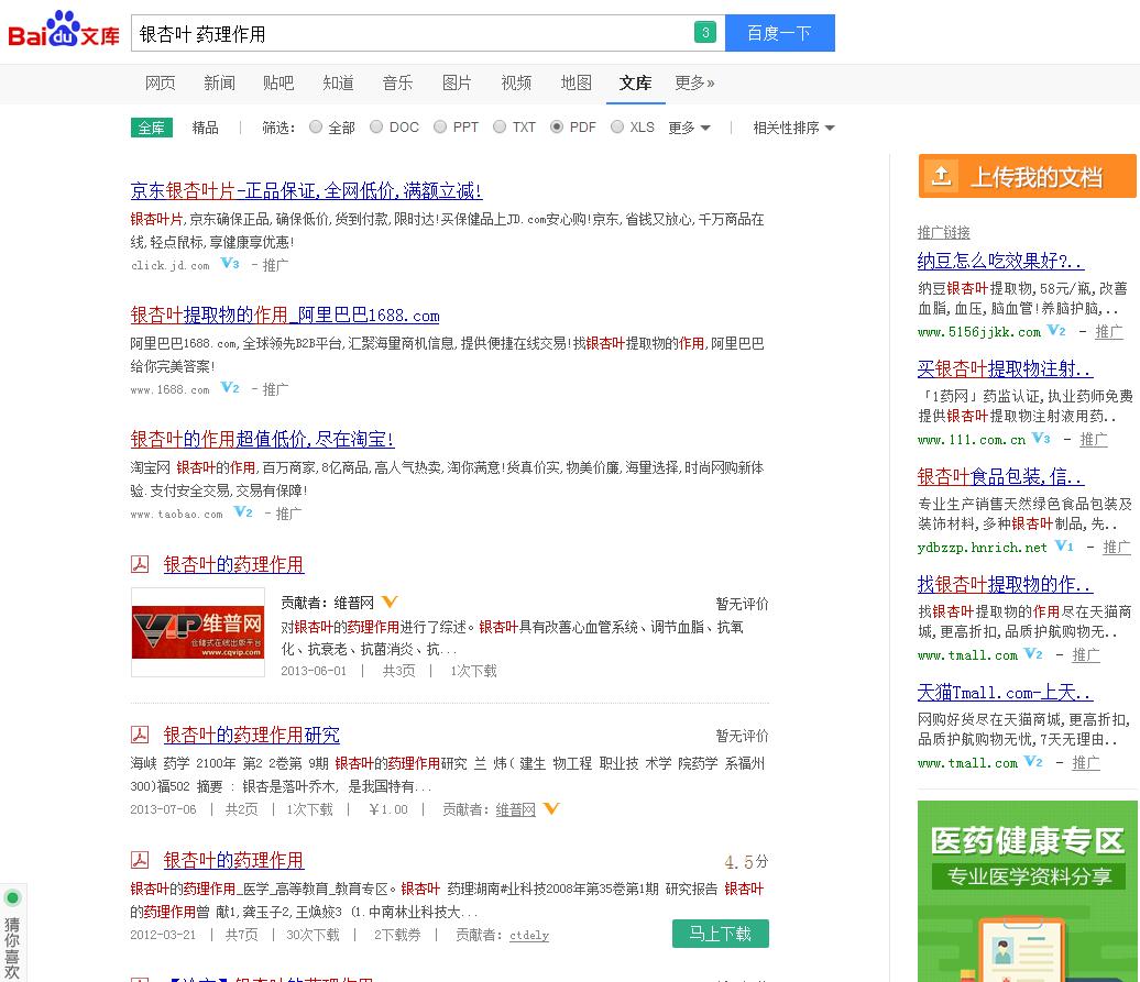 在百度文库检索界面中,检索途径选择PDF,检索框输入检索词银杏叶 药理作用,点击百度一下进行检索,在检索结果中点击其中一篇题目,就可以阅读全文。
