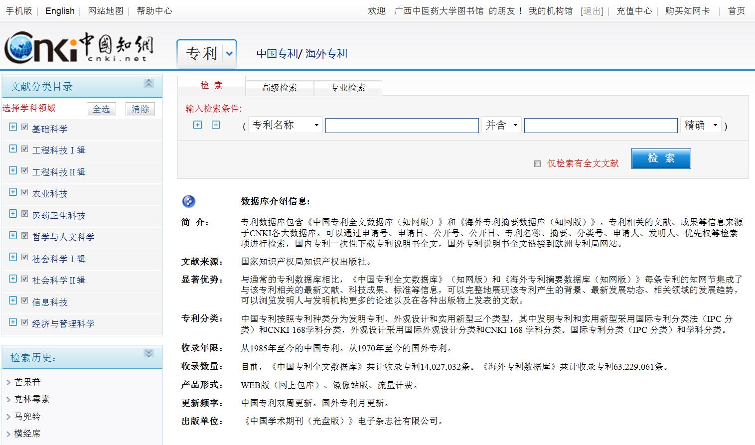 进入CNKI数据库专利检索界面:在CNKI高级检索界面,在文献类型选择里面选择专利,进入CNKI数据库专利检索界面。