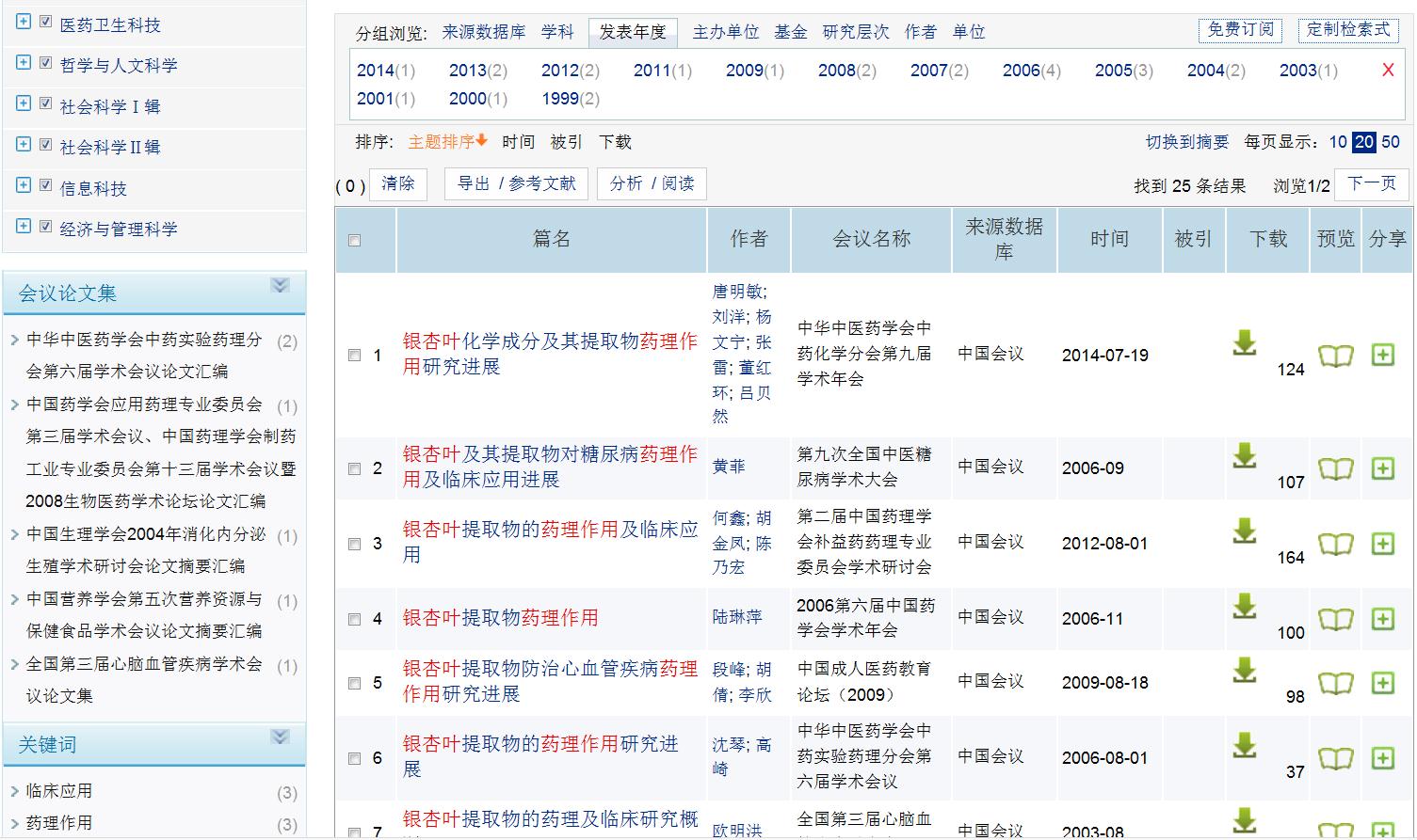 (3)进入检索结果界面:搜索到有关银杏叶药理作用的会议论文25条