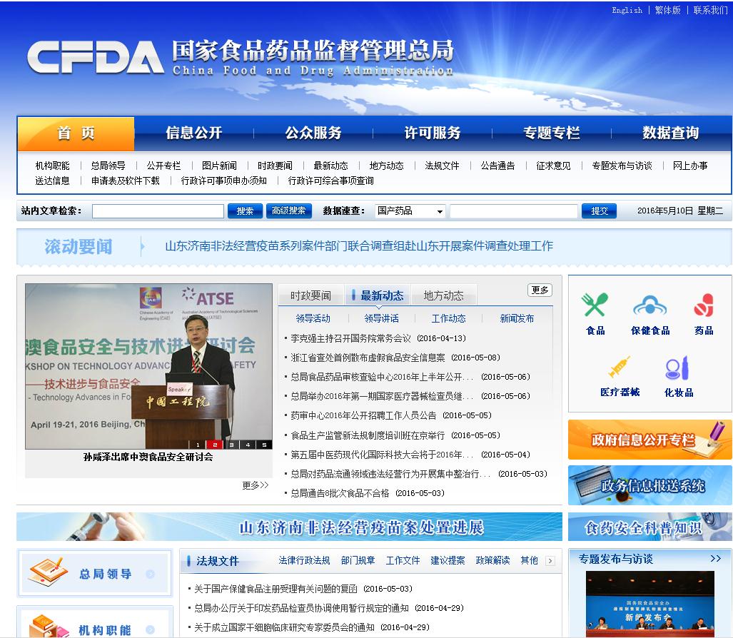 (1)进入国家食品药品监督管理总局网站主页:输入http://www.sda.gov.cn/WS01/CL0001/,进入国家食品药品监督管理局网站主页。