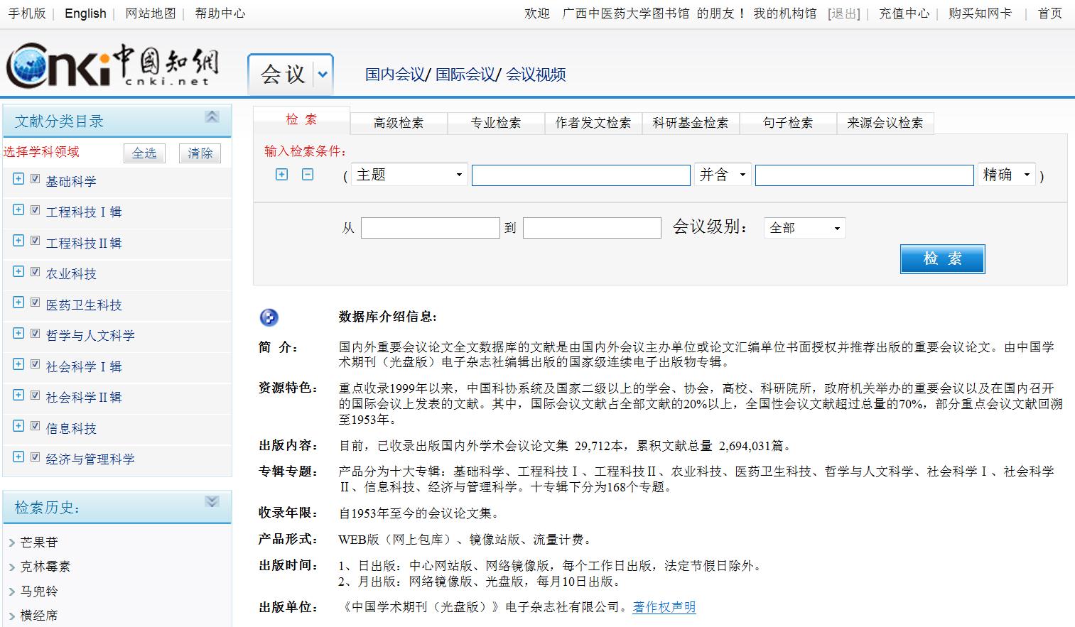 (1)进入CNKI数据库会议论文检索界面:在CNKI高级检索界面,在文献类型选择里面选择会议论文,进入CNKI数据库会议论文检索界面。