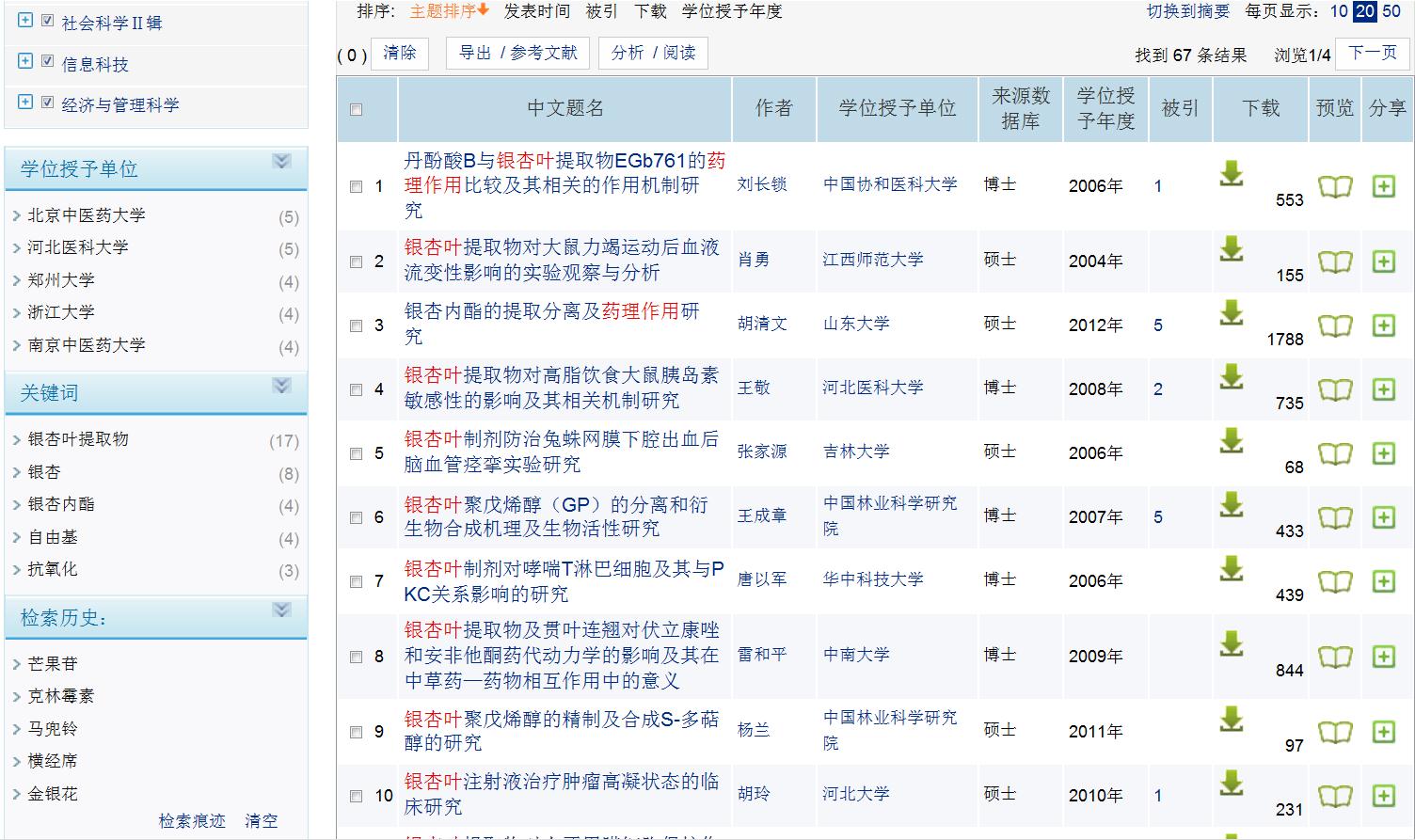 (3)进入检索结果界面:搜索到有关银杏叶药理作用的硕博士学位论文67条