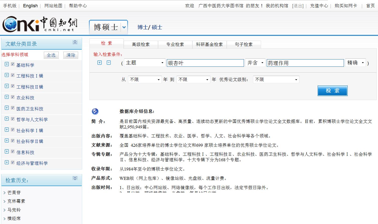 (2)选择检索途径,在检索框输入检索词进行检索:在CNKI数据库硕博士学位论文检索界面中,检索途径选择主题词,检索框输入检索词银杏叶AND药理作用,点击检索进行检索
