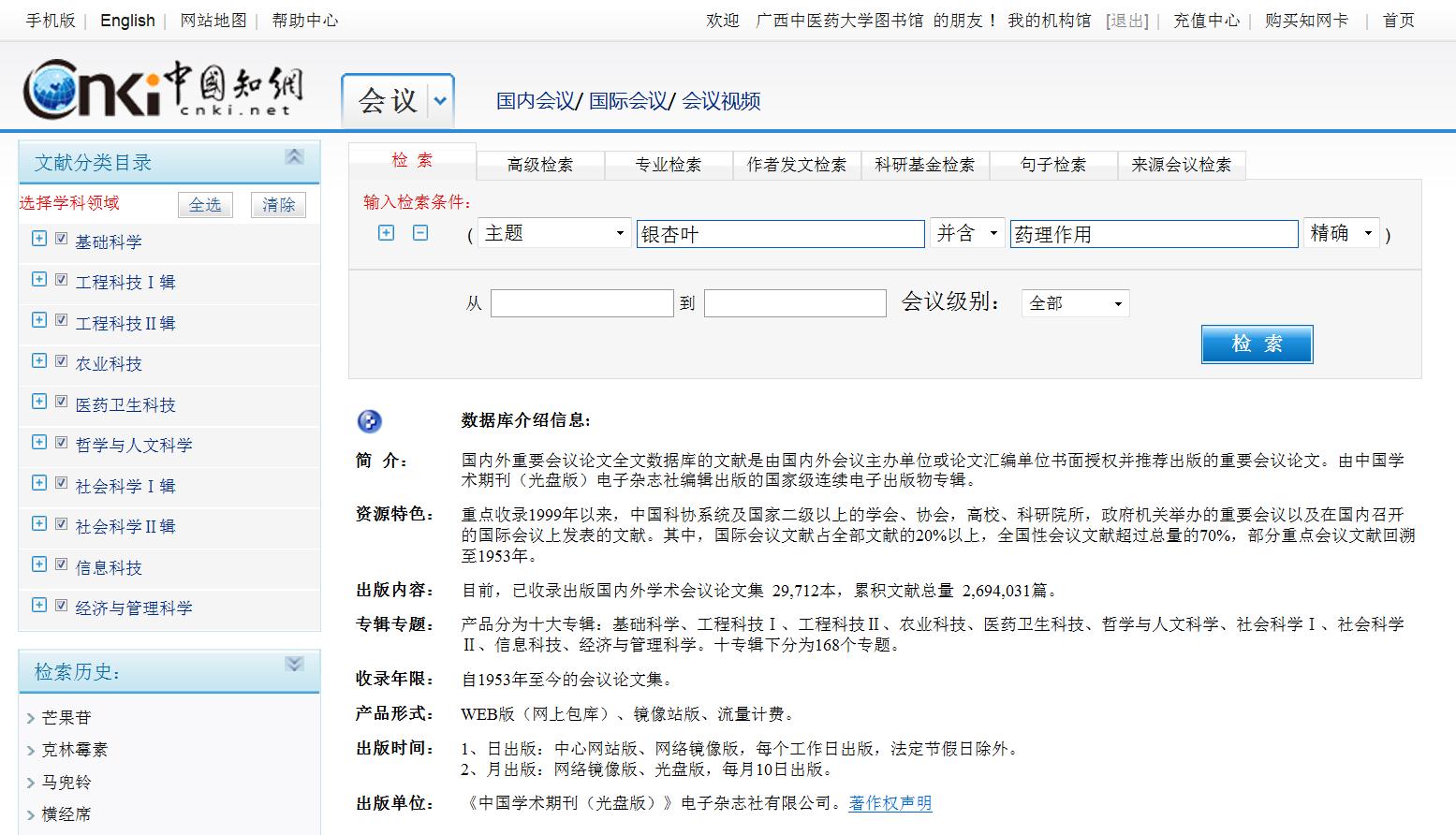 (2)选择检索途径,在检索框输入检索词进行检索:在CNKI数据库会议论文检索界面中,检索途径选择主题词,检索框输入检索词银杏叶AND药理作用,点击检索进行检索
