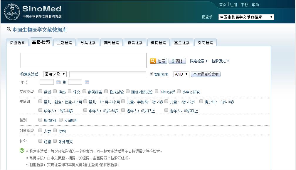 检索与本专业相关的课题(1)进入中国生物医学文献数据库高级检索界面:在学校图书馆主页,将鼠标移到“电子资源”图标,在其下拉的框中,点击中文数据库项下的“中国生物医学文献服务系统”,进入中国生物医学文献服务系统检索界面,然后点击中国生物医学文献数据库,进入中国生物医学文献数据检索界面,最后点击高级检索,进入到中国生物医学文献数据高级检索界面
