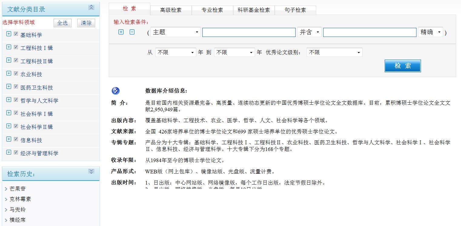 (1)进入CNKI数据库硕博士学位论文检索界面:在CNKI高级检索界面,在文献类型选择里面选择硕博士学位论文,进入CNKI数据库硕博士学位论文检索界面。