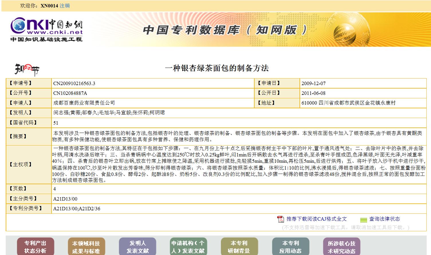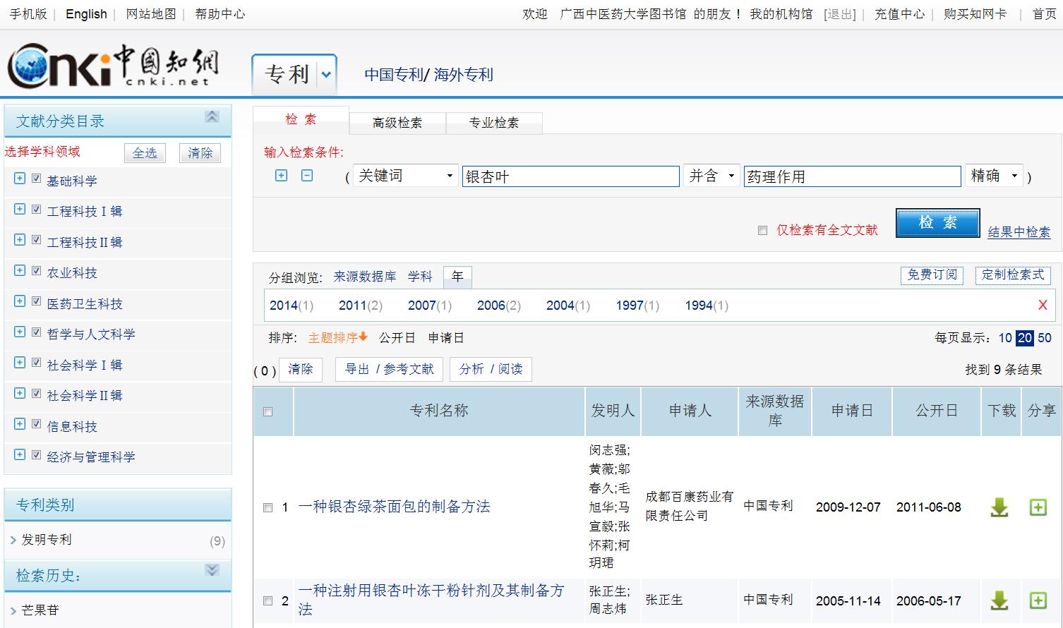 (3)进入检索结果界面:搜索到有关银杏叶药理作用的专利9条