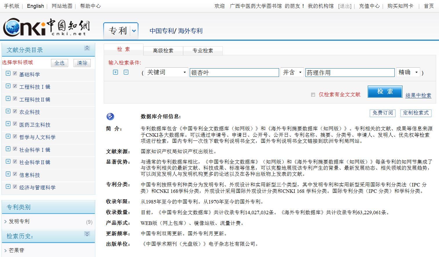 (2)选择检索途径,在检索框输入检索词进行检索:在CNKI数据库专利检索界面中,检索途径选择关键词,检索框输入检索词银杏叶AND药理作用,点击检索进行检索