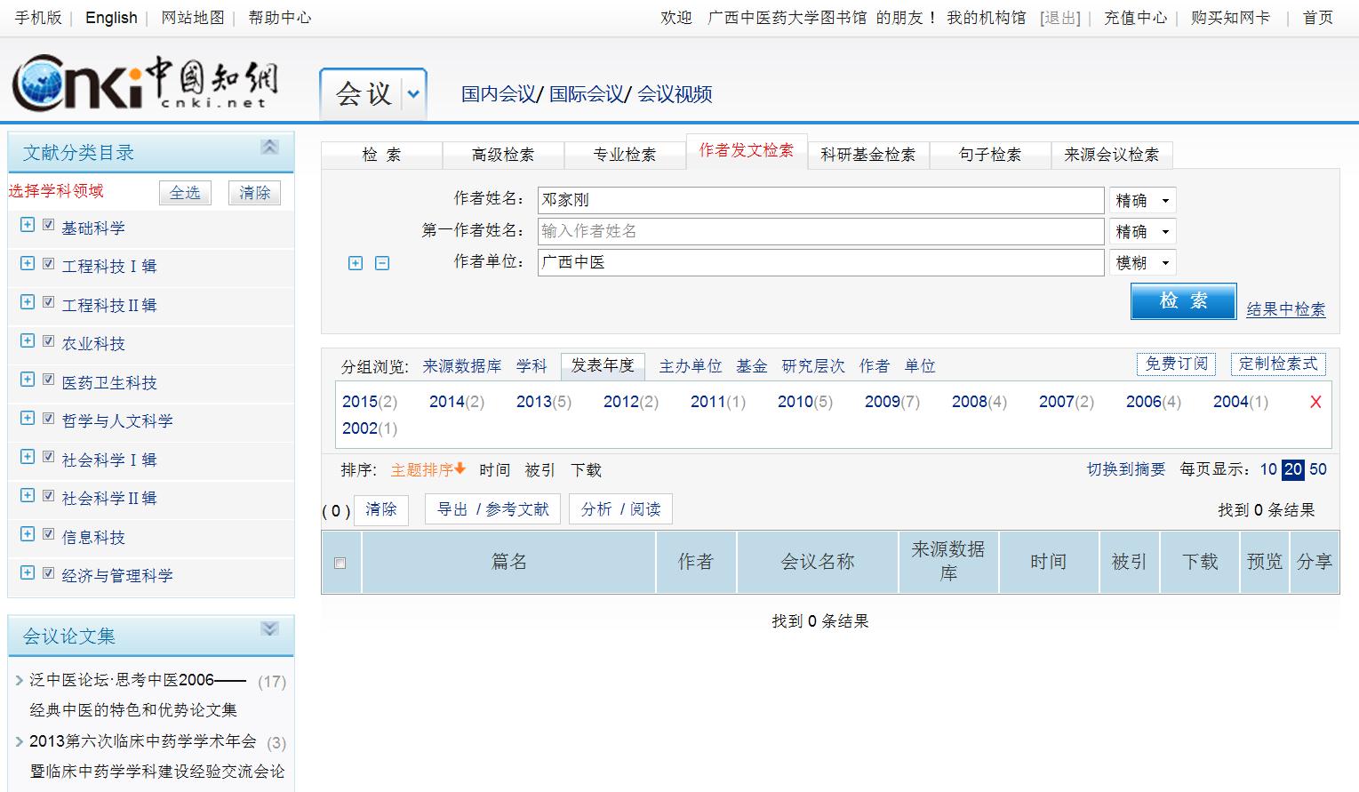 (2)选择检索途径,在检索框输入检索词进行检索:在CNKI数据库会议论文检索界面中,选择作者发文检索,检索途径选择作者和作者单位,检索框输入检索词作者=邓家刚AND作者单位=广西中医,点击检索进行检索