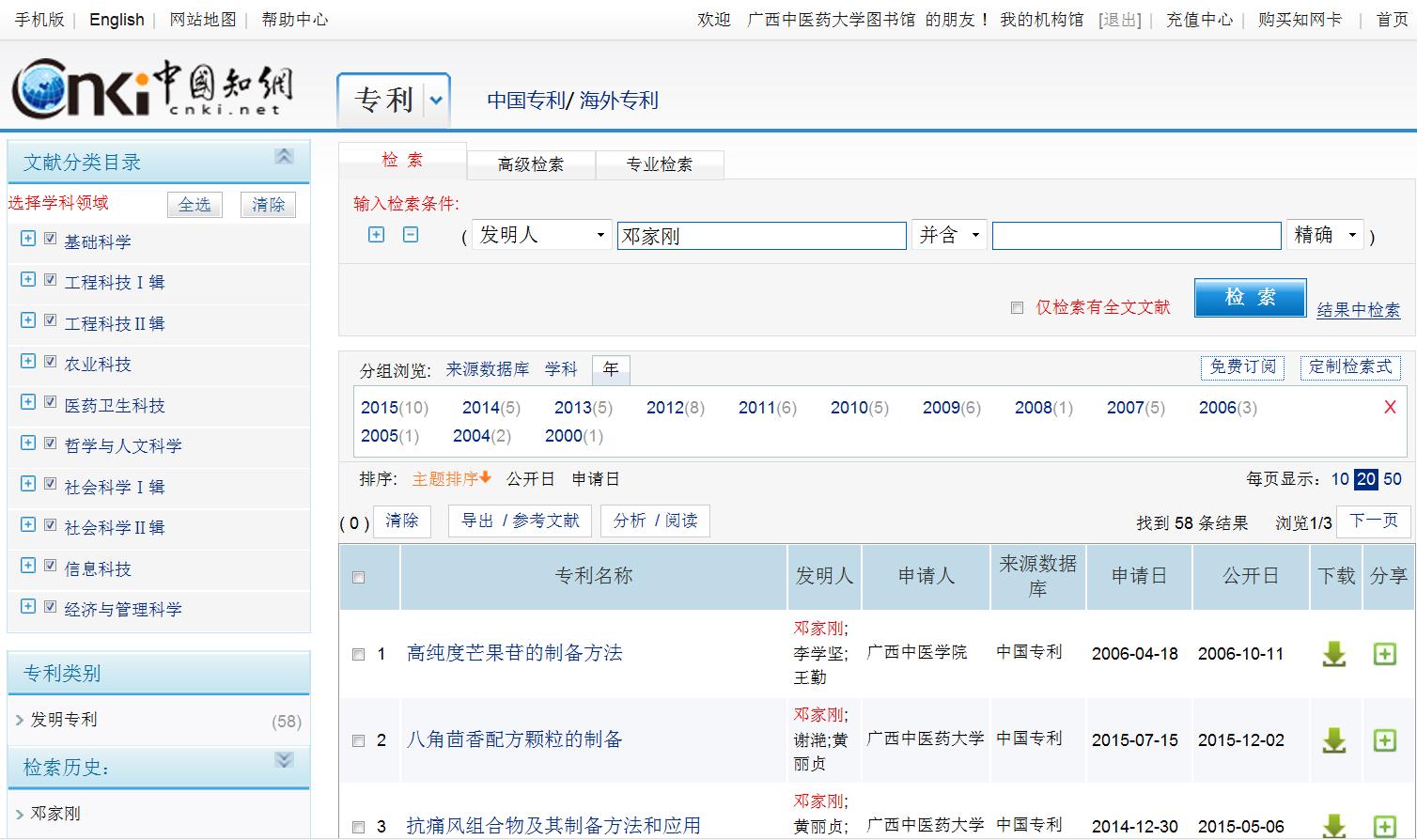 (2)选择检索途径,在检索框输入检索词进行检索:在CNKI数据库专利检索界面中,检索途径选择发明人,检索框输入检索词邓家刚,点击检索进行检索