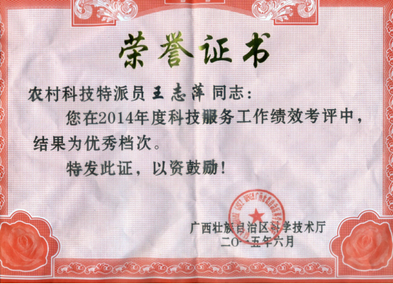 Beat365王志萍教授科技服务地方企业,荣获广西科技厅2014年度科技服务工作绩效考评优秀档次证书