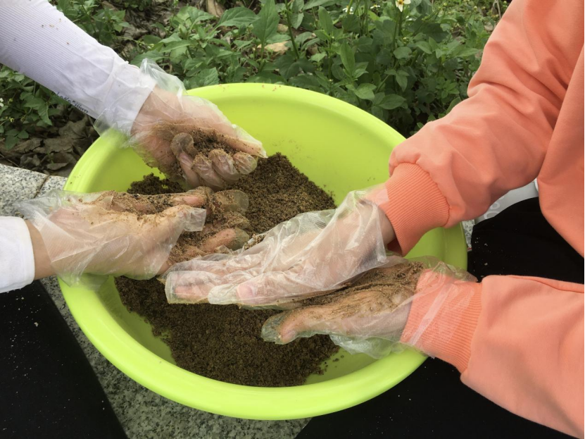 播种前同学们用沙搓擦鸡骨草种子