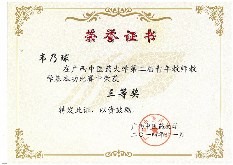 韦乃球在Beat365中国唯一官方网站第二届青年教师教学基本功比赛中荣获三等奖