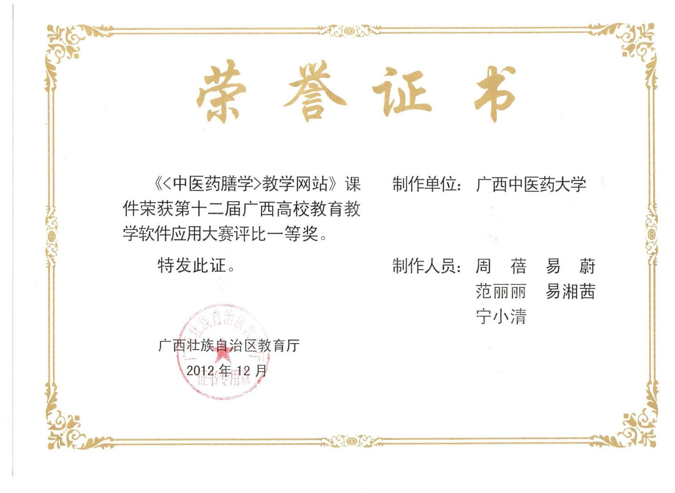 《<中医药膳学>教学网站》课件荣获第十二届广西高校教育教学软件应用大赛评比一等奖