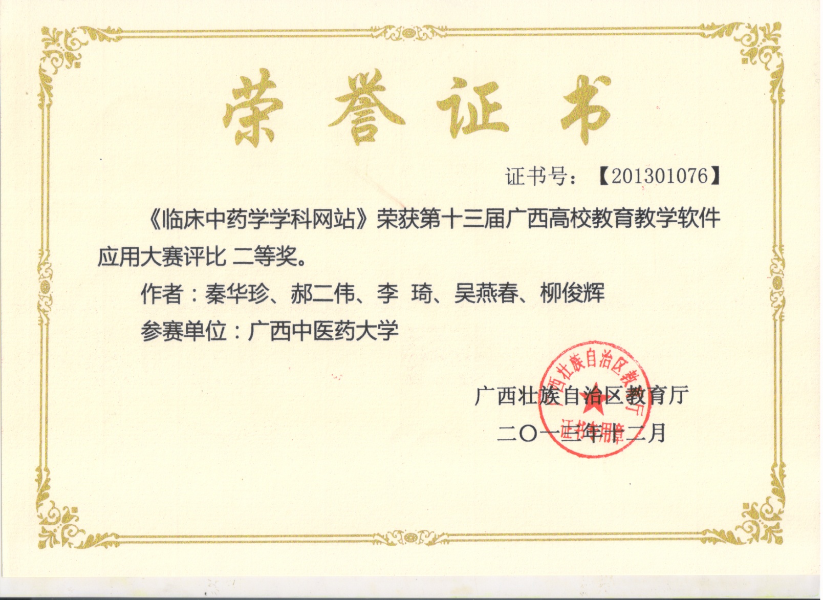 《临床中药学学科网站》荣获第十三届广西高校教育教学软件应用大赛评比二等奖
