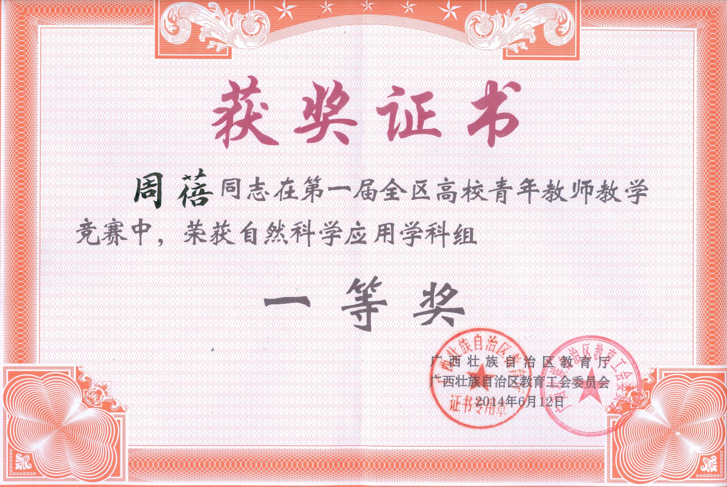周蓓同志荣获自然科学应用学科组一等奖