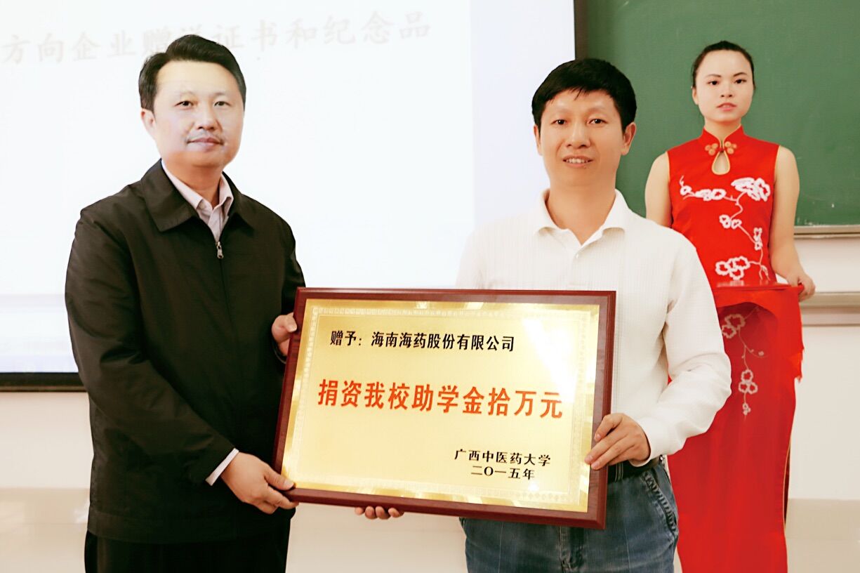 2015年11月2日下午,海南海药股份有限公司助学金颁发仪式于仙葫校区1栋407顺利举行。海南海药股份有限公司陈国林副总经理、Beat365中国唯一官方网站庞宇舟副校长为2015年获得海南海药助学金的45名学生颁发了9万元的助学金。