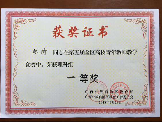 喜讯——我院林瑜讲师荣获第五届广西高校青年教师教学竞赛理科组第一名