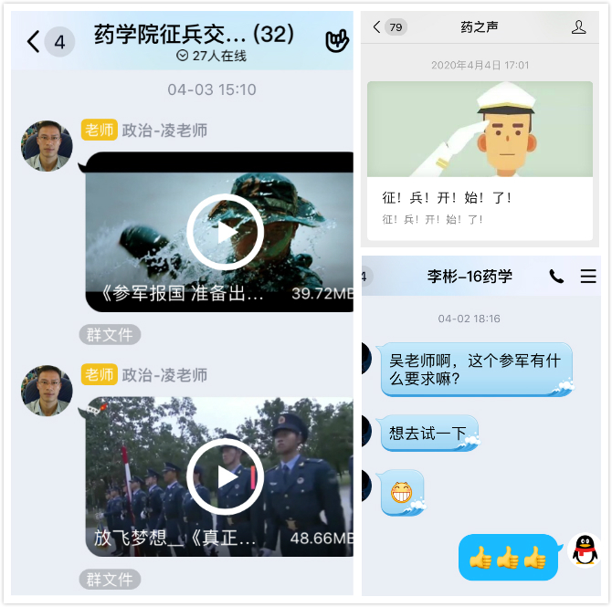 在征兵宣传动员中,同学们积极向年级辅导员了解征兵时间、基本条件、报名基本程序、优待政策、体检标准、入伍后发展等方面最新政策。2016级药学专业李彬同学表示:“我在收到征兵通知后第一时间与辅导员取得联系,表达自己参军入伍的想法,但是又担心视力不佳而导致体检不通过。经过辅导员对征兵政策的耐心解读,我决定坚定参军信念。党和国家号召我们青年大学生参军入伍,这是历史赋予我们的重任,也是每一位中国公民应尽的光荣义务。”