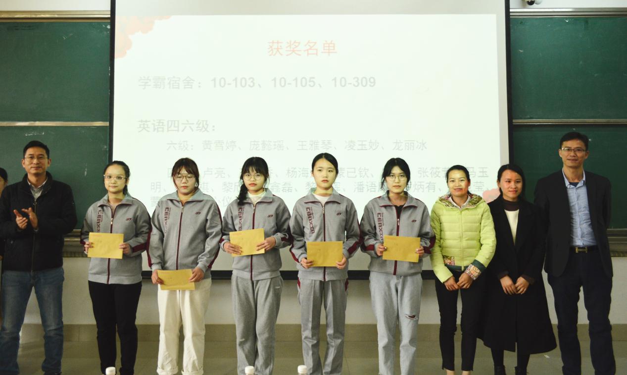 大会表彰环节,与会老师分别为学校奖学金获得者、三好学生、优秀学生干部、学霸宿舍、学习标兵、英语四六级、知识竞赛获奖者等先进集体和优秀个人颁奖。
