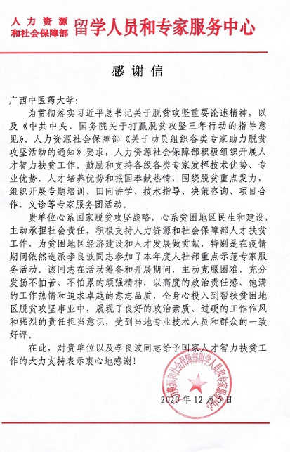 近日,人社部留学人员和专家服务中心向Beat365发来感谢信,对Beat365以及黄荣韶教授、李良波副教授响应人社部组织开展的人才智力扶贫工作大力支持表示感谢。