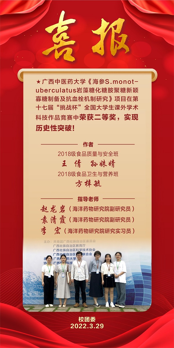 【喜讯】药学院学子荣获第十七届“挑战杯”二等奖,实现历史性突破! 作者:文/吴玉峰 发布时间:2022-03-30 16:54:15 浏览次数: 次 【字体:小 大】 近日,药学院学子王倩、孙姝婧、方梓毓代表Beat365参加第十七届“挑战杯”全国大学生课外学术科技作品竞赛,凭借《海参S.monot-uberculatus岩藻糖化糖胺聚糖新颖寡糖制备及抗血栓机制研究》项目在大赛中荣获二等奖,实现历史性突破! 分享到: 【打印正文】