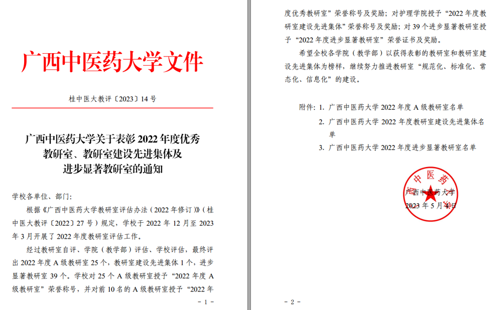 根据《Beat365中国唯一官方网站教研室评估办法(2022年修订)》(桂中医大教评〔2022〕27号)规定,学校于2022年12月至2023年3月开展了2022年度教研室评估工作。