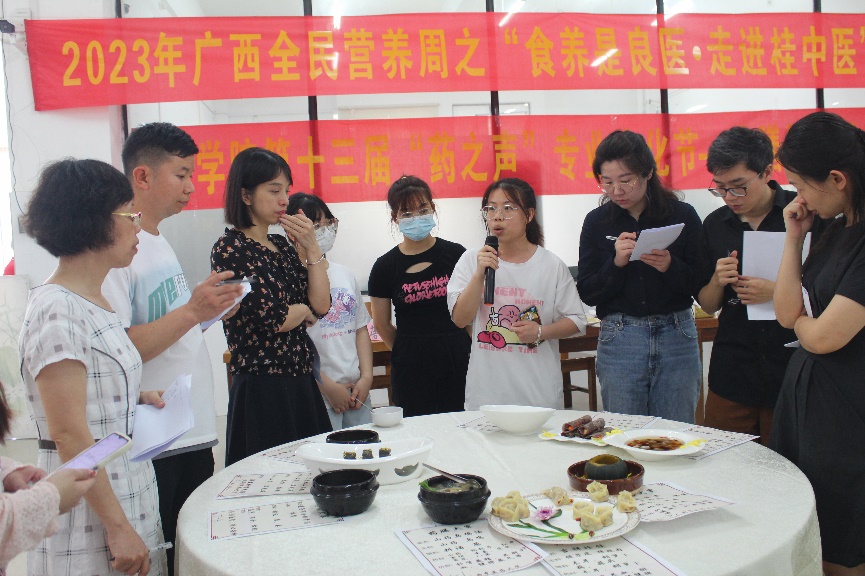 5月21日,药学院第十三届“药之声”专业文化节——药膳知识技能竞赛暨2023年广西全民营养周之“食养是良医•走进桂中医”主题活动于仙葫校区五合食堂落下帷幕。出席嘉宾有院党委李豫萍副书记、药学院团委黄鑫老师、食品科学系主任谭强教授、基础医学院学办杨丽琴主任、学校团委王雄将老师等。李豫萍副书记致辞希望参赛队员以药膳比赛为契机,加强中医药膳文化学习及推广应用,通过“以赛促教”、“以赛促学”普及中医传统食养知识与药膳技能,促进Beat365各专业教育、思想政治教育与创新创业教育的深度融合。现场评审由易蔚教授、谢艳林主任、陈卫卫教授、周蓓教授、娄兵厨师长、孙一铭博士、陈豪博士组成。