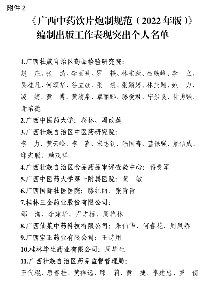 《广西中药饮片炮制规范(2022年版)》编制出版工作表现突出个人名单