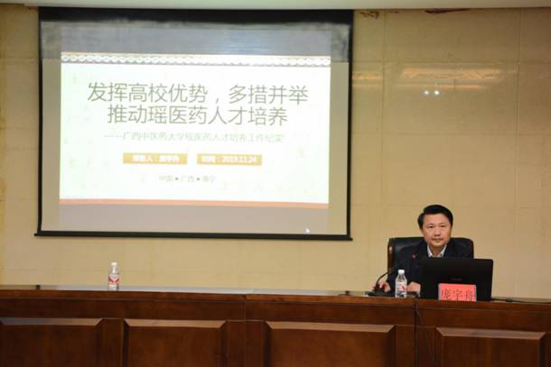 在全国瑶医药学术交流会上,庞宇舟就“发挥高校优势,多措并举推动瑶医药人才培养”内容作了专题报告。