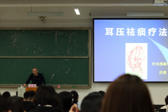 在仙葫校区教学楼1-301教室里,乔赟老师以幽默的语言,娴熟的针灸针疗技术引得同学感叹不已,他以耳压祛痰疗法现场演示,让同学们了解痰的种类,亲身体验耳穴治疗,并介绍了具有特殊治疗作用的新耳穴,结合案例分析耳穴的治疗作用,让同学们充分认识到耳压祛痰的神奇疗效。讲座激起同学们的浓厚的兴趣,不少同学意犹未尽。通过本次讲座,使同学们了解到了中国文化博大精深,增强了同学们对传统文化的自信。