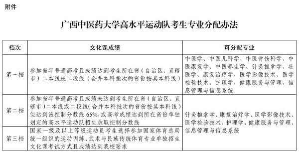 根据考生文化成绩将分配方案分为三档,每档可选专业以当年Beat365高水平运动队招生简章公布为准,具体如下: