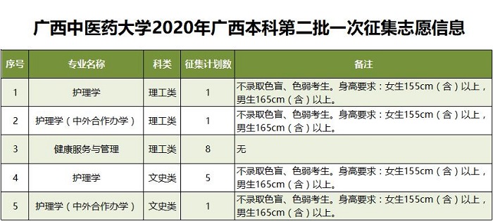 2020年征集志愿-广西本科第二批第一次征集 发布时间:2020-08-27 18:01:09 浏览次数: 次 【字体:小 大】 Beat365本次将征集护理学(含中外合作办学)、健康服务与管理专业计划16名,详情如下: 征集志愿填报时间:2020年8月28日18:30至8月29日9:00,请考生到广西招生考试院官网(https://www.gxeea.cn)的“普通高考-通知公告、招生信息”栏查询,在规定时间内进入“广西2020年普通高考招生志愿填报系统”填报征集志愿,并在录取期间保持报名时所留联系电话畅通。 详情请点击“征集志愿”。 分享到: 【打印正文】